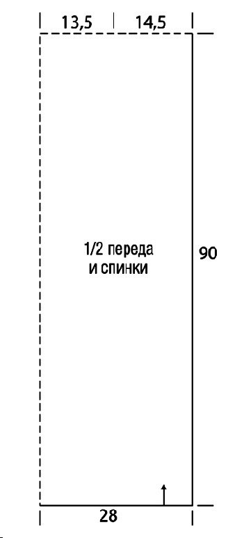 Ажурная накидка на плечи вывязывается цельным полотном. Направления вязки указано на выкройке стрелкой. Начинаем работу крючком No3. Делаем исходную цепочку из 115 ВП плюс 3 ВП подъема. Далее вывязываем основной узор. Через 77р (это около 90см) от начального рядка мы получим 1⁄2 изделия, т. е. мы довязали до воображаемого плечевого шва.