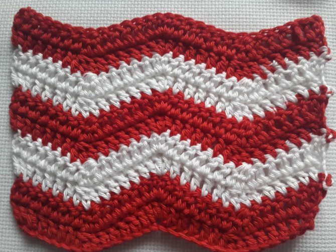 - Зигзаг. Разновидность плотного вязания, при котором на полотне образуется зигзагообразный узор и зубчатый край.