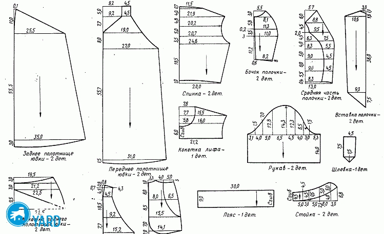 Теперь вам осталось перенести полученные детали на ткань, с помощью мела или обмылка. Не забудьте оставить припуски на швы — 1 см, и припуски на подгибку низа — 4 см. Если ткань очень сыпучая, то припуск можно немного увеличить.
